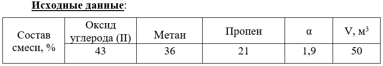 «Определить объём воздуха, пошедшего на горение, и объем образовавшихся продуктов горения при сгорании смеси газов (табл.), если горение происходит при коэффициенте избытка воздуха α. Объем исходной газовой смеси V, м^3.»