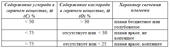 Характер свечения пламени при горении веществ зависит от процентного содержания элементов в веществе, главным образом углерода, водорода, кислорода и азота.