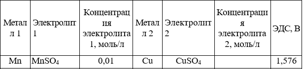 По данным таблицы составьте схему гальванического элемента, определите катод и анод, напишите электронные уравнения электродных процессов и суммарное уравнение соответствующей окислительно-восстановительной реакции. По данным вычислите молярную концентрацию электролита 2