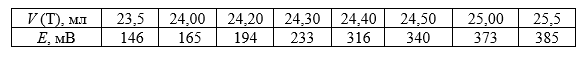 Построить кривую потенциометрического титрования в координатах E – V (интегральную) и определить молярную концентрацию хлорид – ионов в растворе С(Cl-), если при титровании 50 мл анализируемого раствора хлорида калия стандартным раствором нитрата серебра AgNO3 c молярной концентрацией 0,1000 моль/л получили следующие результаты: