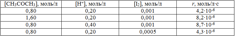 При изучении кинетики реакции йодирования ацетона в кислой среде были получены данные. Определите порядок реакции по каждому веществу.