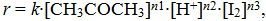 где [СН3СОСН3] и [I2] концентрации соответствующих реагирующих веществ, моль/л;