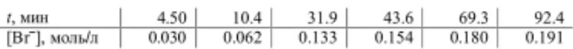 «Щелочной гидролиз α-бромпропионовой кислоты СH3СHBrСОО-+ ОН - → СН3СН(ОН)СОО- + Вг- имеет второй порядок (первый порядок по каждому из реагентов). Ниже даны результаты измерений текущей концентрации продукта Вг-»