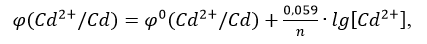 где 0(Cd2+/Cd0) стандартный электродный потенциал, равен - 0,403 В;