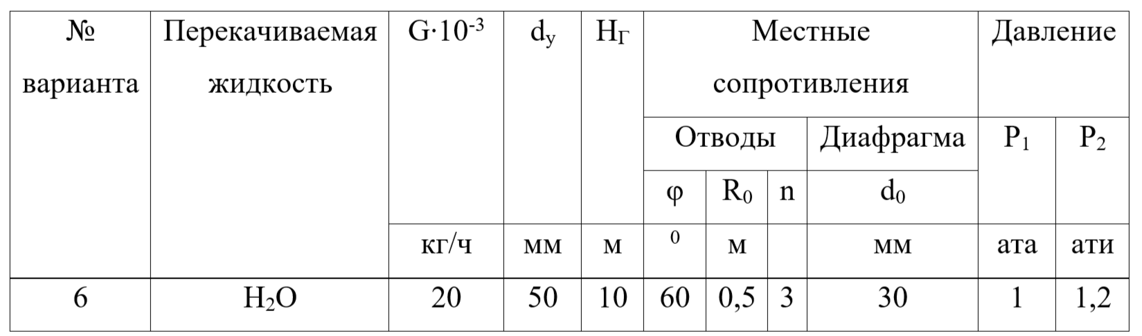 1 – расходная емкость; 2 – приемная емкость; 3 – вентиль нормальный; 4 – отвод радиусом изгиба R и углом φ; 5 – диафрагма диаметром do; 6 – центробежный насос