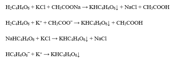 Винная (виннокаменная) кислота H2C4H4O6 и натрий гидротартрат NaHC4H4O6 осаждают ионы калия из нейтральных и слабокислых растворов (рН 4-5) в виде очень мелких белых кристаллов калий гидротартрата:
