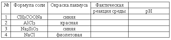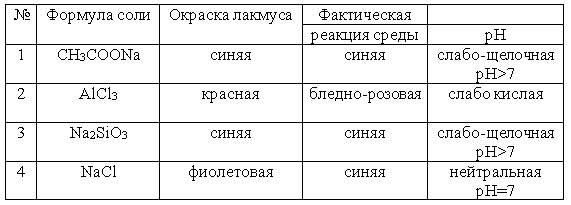 Таблица 1 Результаты изменения окраски раствора лакмуса в ходе гидролиза солей