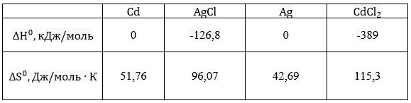 «Вычислить стандартное изменение энергии Гиббса при 25℃ для реакции Cd+2AgCl=2Ag+CdCl_2 по стандартным значениям энтальпии и энтропии.»