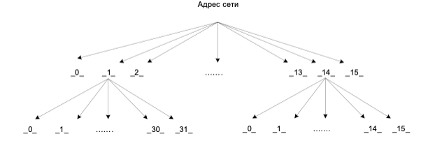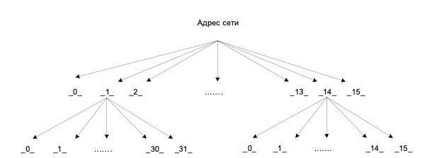 Сеть класса В 132.11.0.0/16 разбиваем на 16 подсетей с маской /20: