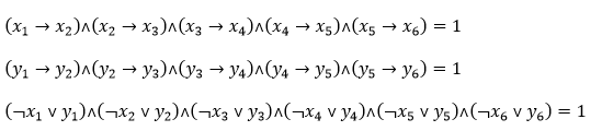 Для того, чтобы равенство выполнялось, необходимо, чтобы каждая скобка была истинной. Импликация ложна только тогда, когда посылка истинна, а следствие ложно.