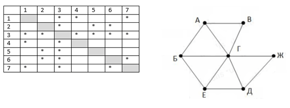 «В таблице звездочкой обозначено наличие дороги из одного населенного пункта в другой. Определите какие номера населенных пунктов в таблице могут соответствовать населенным пунктам Б и Е на схеме. В ответе запишите эти два номера в возрастающем порядке»
