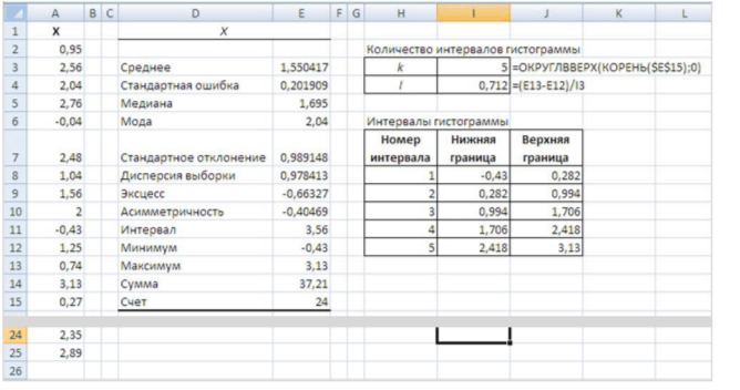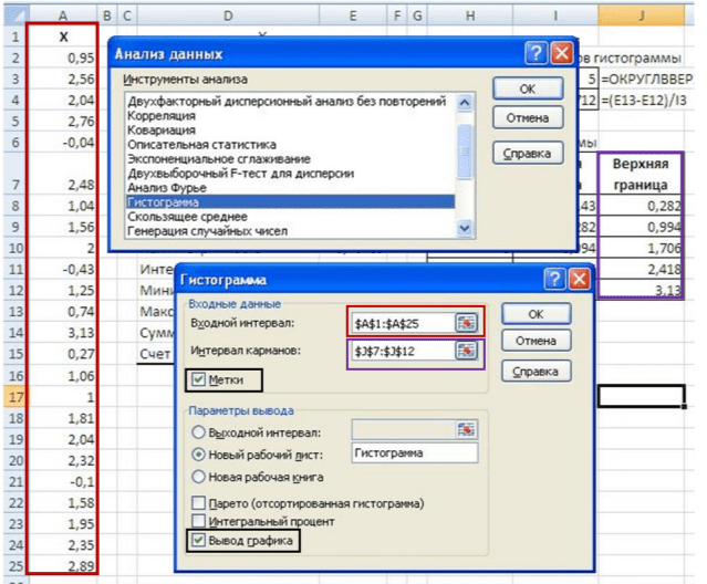 Результат расчёта границ интервалов показан на рис. 1, диалог процедуры Гистограмма на рис. 2.