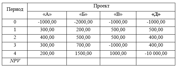 Фирма рассматривает несколько инвестиционных проектов, затраты и дисконтированные потоки платежей по которым представлены в таблице. Инвестиционная политика фирмы предусматривает использование показателя DPP в качестве критерия отбора проектов, контрольный срок окупаемости составляет не более 3 лет.