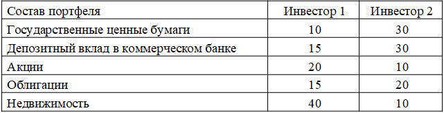 По приведенной ниже структуре портфелей инвестиций (в процентах к общей сумме вложений) определите тип инвесторов в зависимости от их отношения к риску (консервативный или агрессивный) и возможностей получения дохода (текущие выплаты или прирост