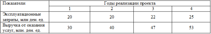 Предприятие инвестировало на строительство гостиницы 40 млн ден. ед. Ежегодные текущие затраты на эксплуатацию гостиницы и выручка от оказания услуг приведены в таблице.