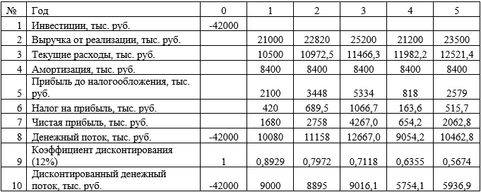 отчисления на оборудование производятся по методу прямолинейной амортизации в размере 20%. Выручка от реализации продукции, выпущенной на данном оборудовании, должна составить: 21000 тыс.руб., 22820 тыс.руб., 25200 тыс.руб., 21200 тыс.руб., 23500 тыс.руб.