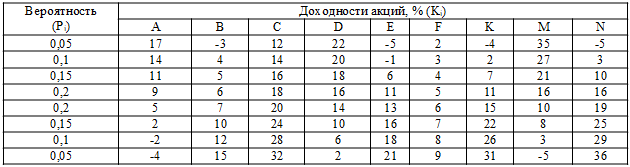 Рассчитать значения ковариации на основе распределения вероятностей доходностей акций:
