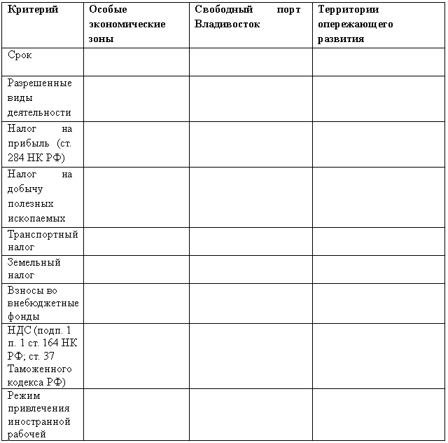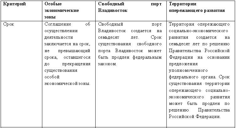 Заполните таблицу, изучив Федеральный закон "Об особых экономических зонах в Российской Федерации" от 22.07.2005 N 116-ФЗ, Федеральный закон "О территориях опережающего социально-экономического развития в Российской Федерации" от 29.12.2014 №254-ФЗ, Федеральный закон "О свободном порте Владивосток" от 13.07.2015 N 212-ФЗ