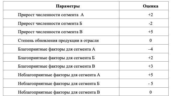 Примечание: Параметры в таблице оценены по шкале от -5 до +5, где 0 означает, что в будущем сохранятся прежние характеристики. Минус 5 означает, что в перспективе оцениваемый параметр ухудшится, плюс 5- улучшится. Максимальное значение комплексной оценки соответствует большей привлекательности сегмента.