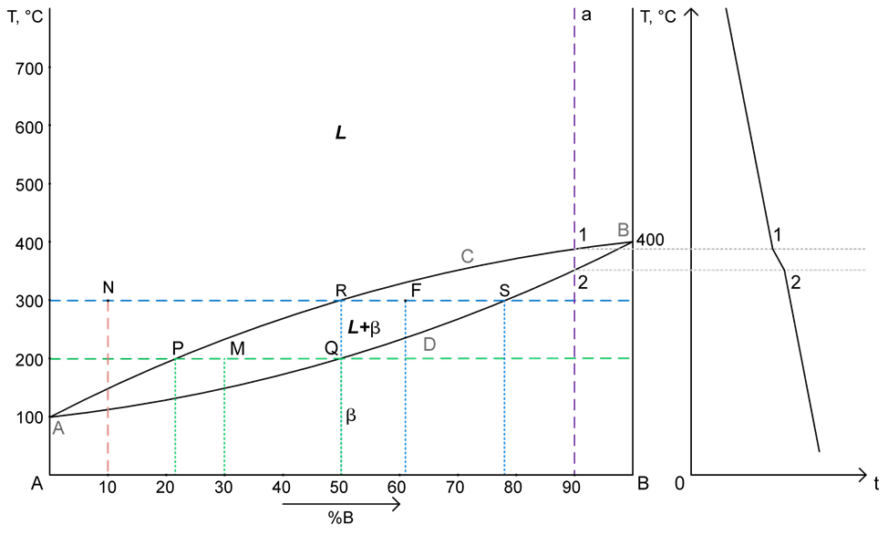 3. Начертить кривую охлаждения для сплава, содержащего 90%В.