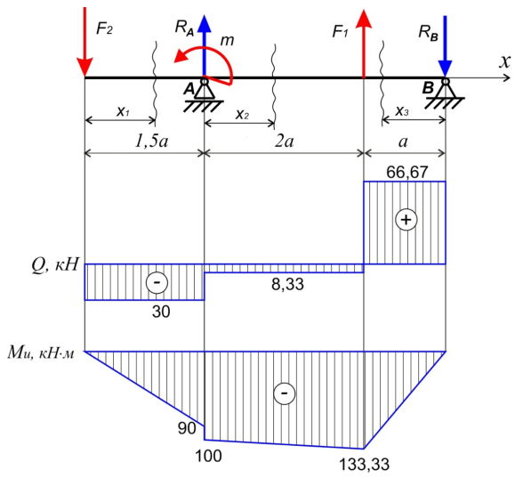 Для двухопорной балки требуется: - построить эпюры поперечных сил Q и изгибающих моментов Mи; - определить из расчета на прочность диаметр поперечного сечения.
