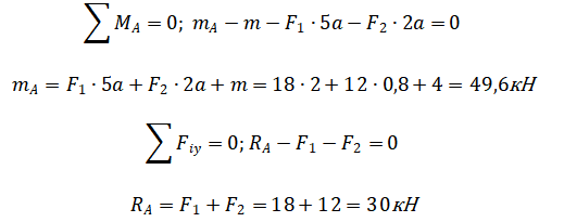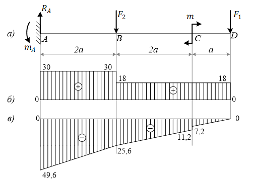 «Для одноопорной балки, нагруженной сосредоточенными силами и парой сил с моментом , построить эпюры поперечных сил и изгибающих моментов.»