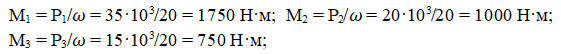 P1=35 кВт, P2=20 кВт, P3=15кВт, ω = 20 рад/с