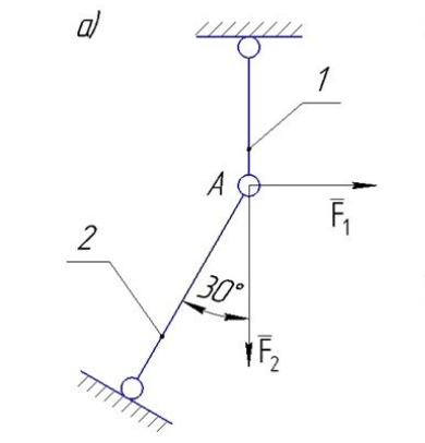 «Кронштейн, состоящий из стержней 1 и 2 нагружен силами F1 и F2. Определить реакции обоих стержней. Освобождаем шарнир А от связей и изображаем действующие на него активные силы и реакции связей»