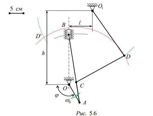 По заданным размерам звеньев, заданным расстояниям h и ℓ, а так же по заданному углу построим механизм в выбранном масштабе (рис. 5.6).