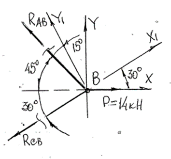 Техническая механика Дано: Р = 14 кН. Рис.1.1 - Стержневая конструкция Вырезаем мысленно узел В и рассматриваем его равновесие. Реакция нити чис-ленно равна весу Р груза и направлена горизонтально.