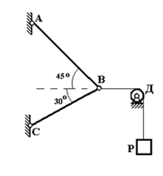 Вырезаем мысленно узел В и рассматриваем его равновесие. Реакция нити численно равна весу Р груза и направлена горизонтально.