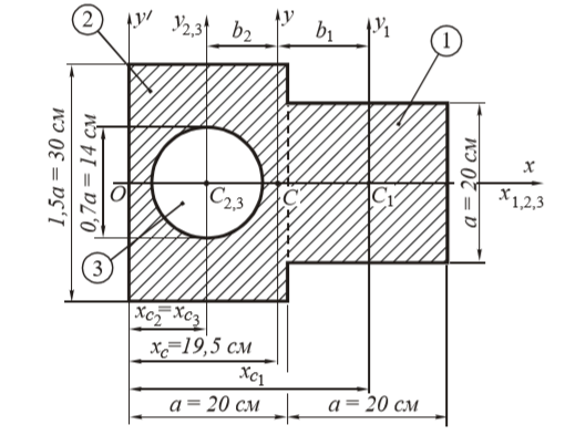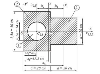 1. Сечение вычерчивается в масштабе 1:2 и разбивается на простейшие фигуры: квадрат (1), прямоугольник (2) и круговое отверстие (3). На чертеже показываются центры тяжести составляющих фигур (точки C1 и C2,3) и проводятся их главные центральные оси x1, y1; x2, y2 и x3, y3 (рис. 2.5).