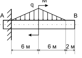 Условие задачи: Брус АВ жестко закреплен в стене. Требуется: Определить реакции стены, если на брус действуют линейно распределенная нагрузка q и пара сил с моментом М. Исходные данные: q=6 кН/м, М=5 кН м; рисунок - 5.