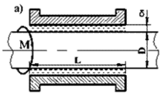 Зазор А между валом и втулкой заполнен индустриальным маслом. Длина втулки L = 1500 мм. К валу, диаметр которого D = 500 мм, приложен постоянный вращающий момент М = 640 Н·м. Толщина зазора δ = 3 мм.