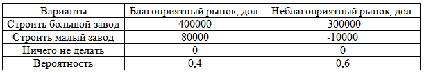 Президент компании решает, строить или не строить промышленное предприятие. Его решения сведены в таблицу.