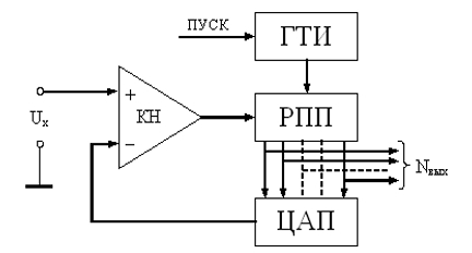 Суть метода поразрядного уравновешивания заключается в последовательном сравнении входного преобразуемого напряжения Ux с напряжением обратной связи Uос формируемым с помощью цифроаналогового преобразователя (ЦАП) по закону последовательного приближения к преобразуемому напряжению Ux до момента наступления равенства и...