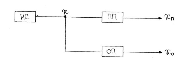 где ИС источник сигнала, от которого подается требуемое значение физической величины "X"; xп показания поверяемого прибора "ПП", которые сравнивают с показаниями x0 образцового прибора "ОП".