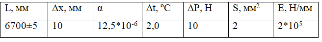 Выбрать средства измерения с учетом погрешности, используя данные, приведенные в табл. 2.1. L = 6700±5 мм; ∆x = 10 мм; α = 12,5*10^-6; ∆t = 2,0 ºC; ∆P = 10 H; S = 2 мм2; E = 2*10^5 Н/мм