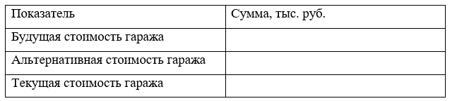 Будущая стоимость гаража FV составляет 650 тыс. рублей. текущая стоимость гаража PV равна этой сумме, приведенной к текущему моменту по доходности альтернативных проектов
