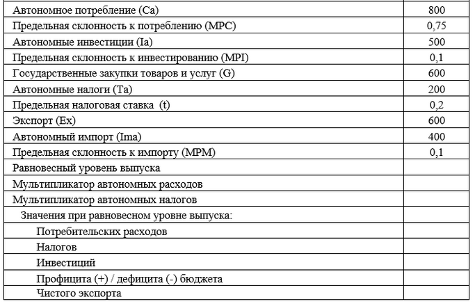 По условиям, которые представлены в задаче, необходимо определить и вычислить недостающие значения. Найти: равновесный уровень выпуска, мультипликатор автономных расходов и т.д.