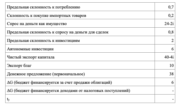 Поведение макроэкономических субъектов характеризуется данными, представленными в таблице. Государство проводит стимулирующую налогово-бюджетную политику ∆G.