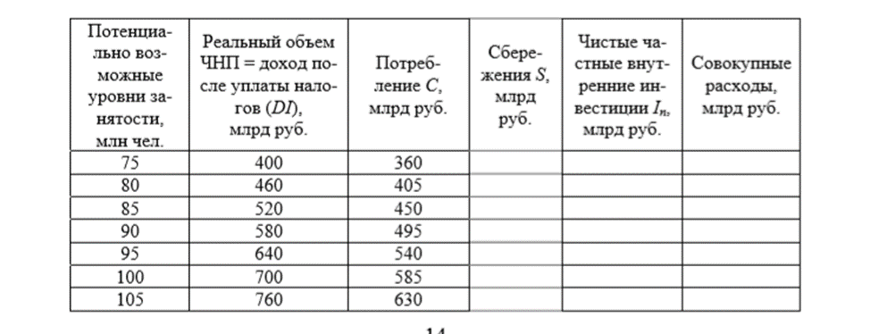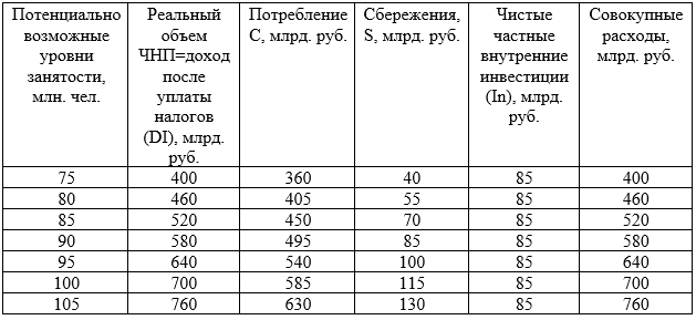 Предположим, что уровень чистых частных внутренних инвестиций (In) составляет 85 млрд руб. и не зависит от объема производства. Дополнительные данные о возможных потенциальных уровнях занятости и соответствующих им уровнях реального объема ЧНП и потребительских расходов приведены в таблице.