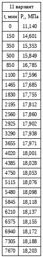 В результате исследования добывающей скважины на неустановившихся режимах получены значения забойного давления в различные моменты времени после остановки скважины. Определить фильтрационные параметры пласта, если известны толщина пласта, вязкость нефти и дебит скважины при установившемся режиме.