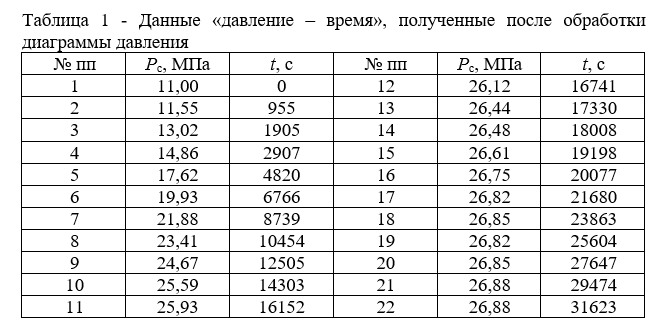 В таблице 1 приведены данные «давление – время», полученные после обработки диаграммы давления.