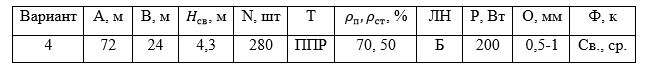 В производственном помещении длиной А и шириной В установлено N светильников типа Т с лампами накаливания ЛН мощностью Р. Воздушная среда помещения загрязнена пылью и дымом концентрацией свыше 5 мг/м3. Высота подвеса светильник в Нсв, коэффициенты отражения потолка , стен