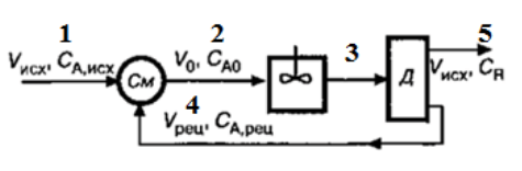 В реакторе идеального смешения протекает реакция 2А = R. Производительность по продукту А составляет 16,2 кмоль/ч, константа скорости реакции – 0,05 м3/(кмоль·с), степень превращения в реакторе – 0,65, концентрация вещества А в исходном потоке и в рецикле – 1,7 кмоль/м3.