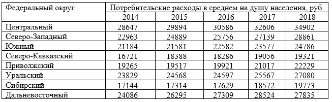 Таблица 4 – Потребительские расходы в среднем на душу населения по федеральным округам