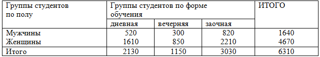 1.Определить по этим данным : а/ удельный вес студентов – мужчин и женщин, обучающихся по каждой из трех форм обучения и всем трем формам обучения в целом /
