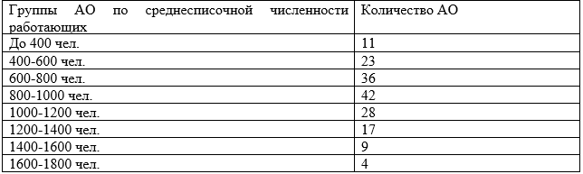 Акционерные общества области по среднесписочной численности работающих на 1 января 2012 г. распределялись следующим образом: