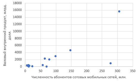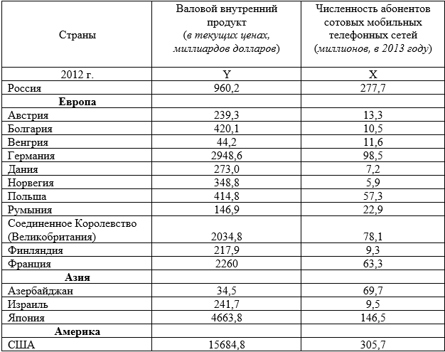 Для изучения тесноты связи между валовым внутренним продуктом (результативный признак – игрек) и численностью абонентов сотовых мобильных телефонных сетей (факторный признак – икс)